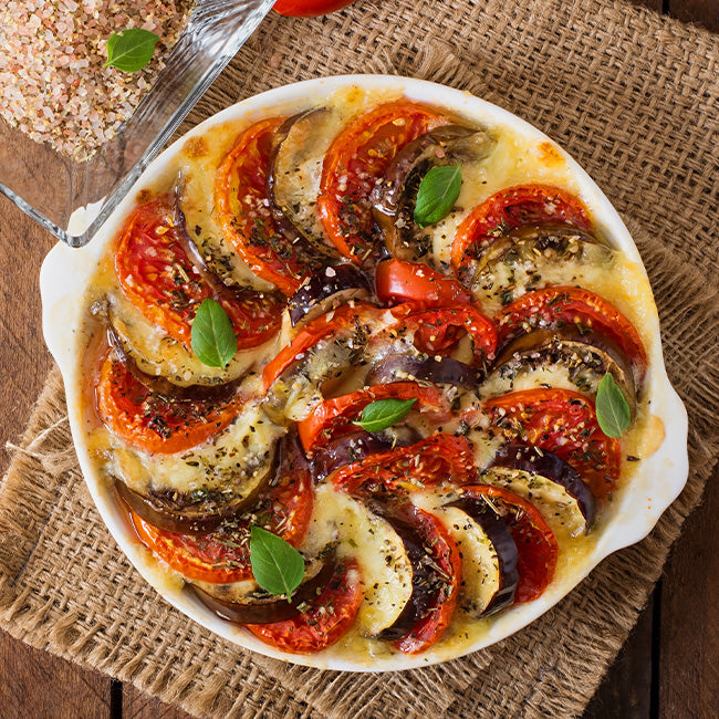 Slice eggplant, sprinkle with salt and stand for 30 minutes. Rinse well and pat dry. In a heavy bottomed saucepan layer the vegetables.